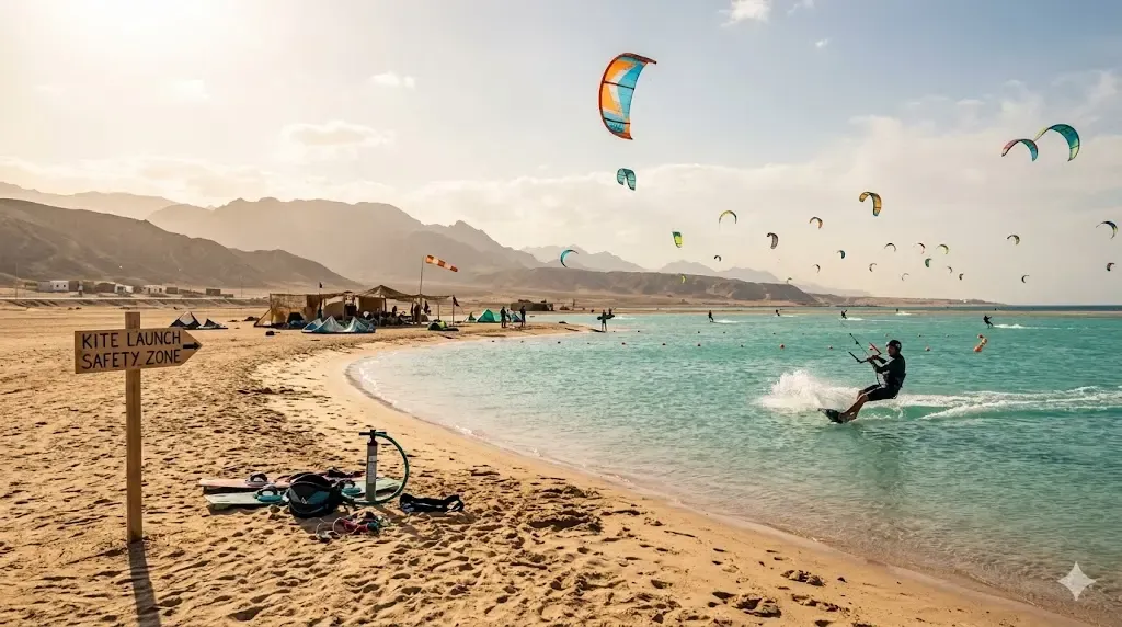 • Safaga : moins bondé, bon pour le freeride, plus engagé quand ça souffle fort. Convient aussi aux débutants sur certaines zones encadrées.